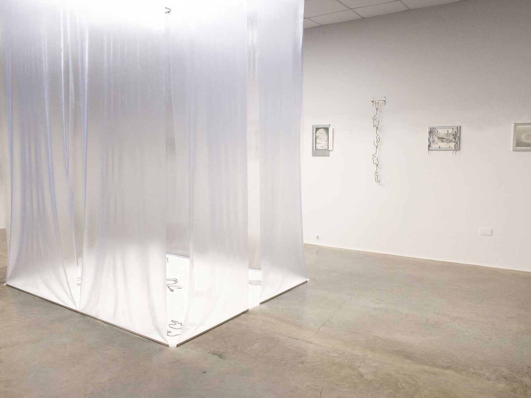 El ambiente brumoso de Nariño reaparece, mutado, en la penumbra de la sala. Una opacidad producida, deliberada. Ésta es una puesta en escena donde habitan distintos espectros, entre ellos, los ríos fantasma y las cascadas furtivas cuyos caudales golpean con voracidad la superficie de concreto de una autopista. Aunque lo fantasmal se representa como algo atmosférico, en realidad trata también sobre la pérdida de toda ilusión y destino; de un sitio o tiempo redentor (o esperanzador al menos). “La desaparición del futuro”, escribía el teórico cultural Mark Fisher en 2012, “significaba el deterioro de un modo entero de imaginación [social]: la capacidad de construir un mundo radicalmente distinto de aquel en que vivimos actualmente”. Más de una década después, ¿dónde pueden encontrarse intentos por construir ese mundo otro y no por salir de él?
